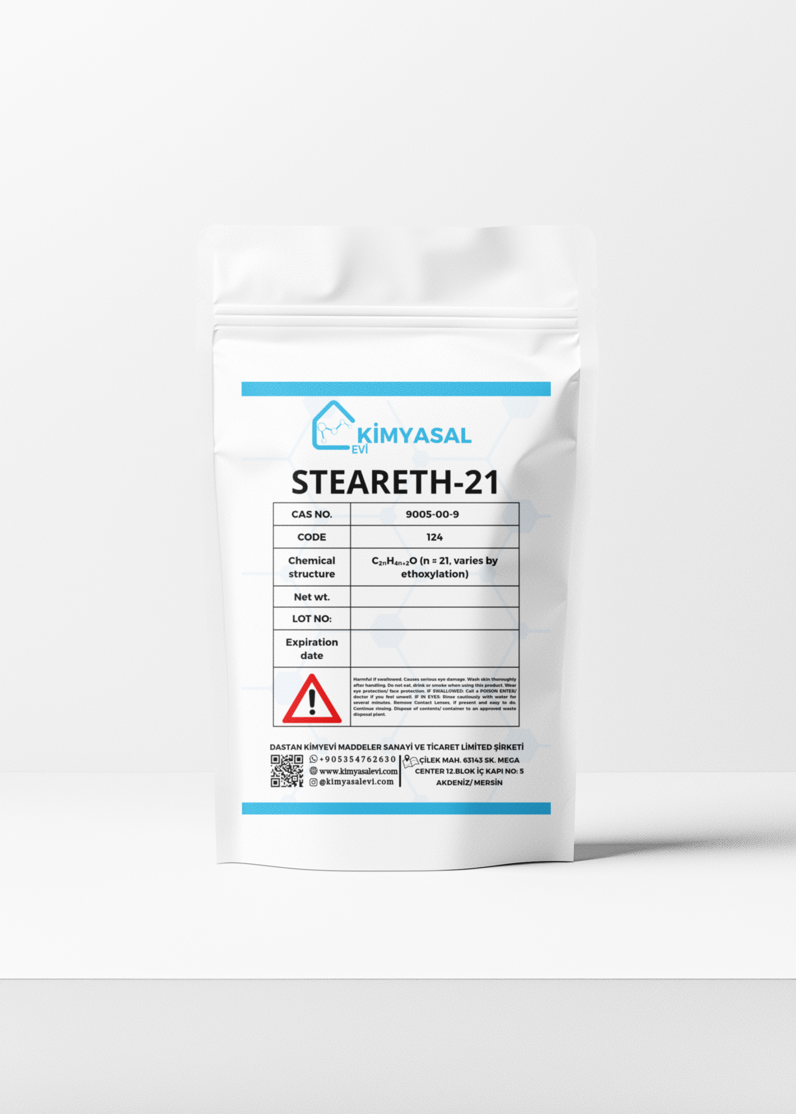 Steareth-21 kozmetikte ve cilt bakımında kremler, losyonlar, serumlar ve su/yağ (O/W) emülsiyonlarında emülgatör olarak kullanılır, yağ ve su fazlarını homojen şekilde birleştirerek ürünün stabilitesini artırır ve uygulama sırasında ürüne pürüzsüz, yumuşak bir his kazandırır, formülasyonun ayrışmasını önler ve cilde kolay yayılmasını sağlar, kullanım oranı genellikle ürün tipine ve istenen emülgasyon gücüne bağlı olarak %1 – %5 arasındadır, formül hazırlanırken yağ fazına eklenir ve tam çözünme için gerekirse hafifçe ısıtılır, diğer bileşenlerle iyi şekilde karıştırılarak homojen bir emülsiyon elde edilir, çoğu yağ ve diğer emülgatörlerle uyumludur, izin verilen konsantrasyonlarda topikal kullanım için güvenlidir ve genellikle ciltte tahrişe neden olmaz.